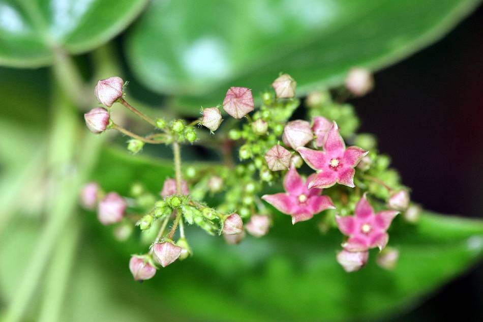 | 花多數,小型,花苞黃綠色,開放時徑 0.5~0.6 公分,呈腋生繖房狀聚繖花序排列;花序長 1~2 公分,具毛茸;花柄細長,長 0.8~1.5 公分,有毛茸;花萼小,5 深裂,毛緣;花數甚多而小,花冠輻形,帶暗紫紅色,5 深裂;裂片 5 枚,卵狀披針形,長 0.4~0.5 公分,寬 0.2~0.3 公分,先端漸尖;雄蕊副花冠具 5 枚短圓形腺狀鱗片,著生於雄蕊筒基部,先端鈍,高達花藥之半;花藥頂端膜質,內捲,每一藥室中僅有一枚花粉塊,花粉塊水平伸展;柱頭盤狀。花期 5~9 月。 | |