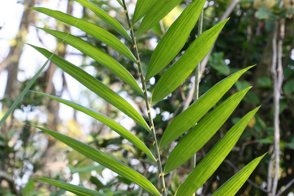 葉為羽狀複葉,叢生枝端,長 1~2 公尺;總葉柄上部延長而不具小葉,下側具 2~3 對逆刺,藉以攀緣上昇;葉鞘密被闊扁長銳刺;小葉長 30~50 公分,寬 2~4 公分,線形或披針形,葉尖銳尖,細鋸齒緣,平形脈明顯,中肋(不明顯)每側具小脈 3~5 條;葉柄近無;葉軸末端具刺鞭;葉鞭外面具表面具刺之膝狀突起。